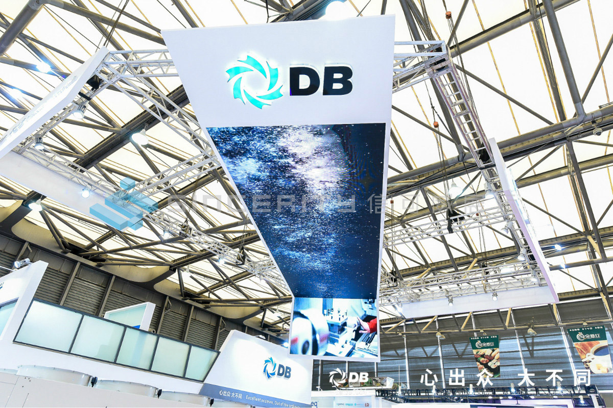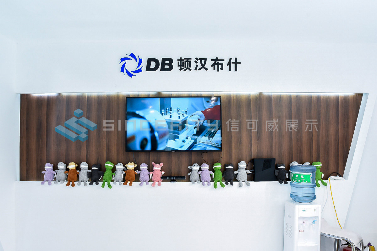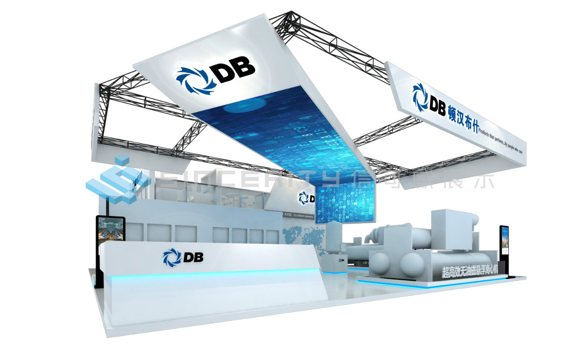 DB頓漢布什展臺設計以白為主色,藍色為輔色,展臺中央采用高科技折屏,著重突出DB品牌和產品的展示,契合DB全球品牌戰略的輸出,將情懷與科技融為一體。