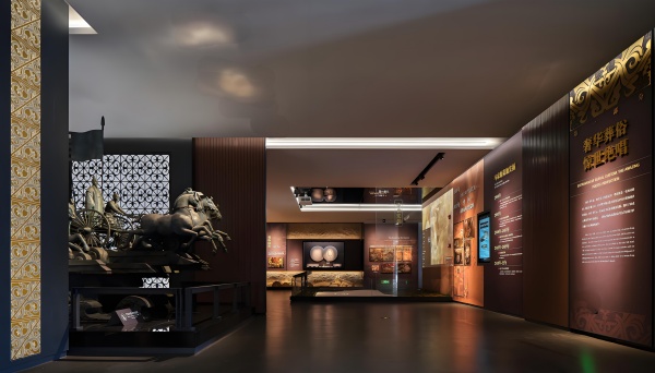 進入展館,觀眾首先進入前廳部分。前廳是功能區的一部分和參觀的準備區。前廳兩側均勻分布山川水墨畫,與古井貢酒產品蘊含的清新淡雅之風相得益彰,使觀眾對古井貢酒的產品有一個初步的認識。參觀觀眾向右進入展館進行參觀。