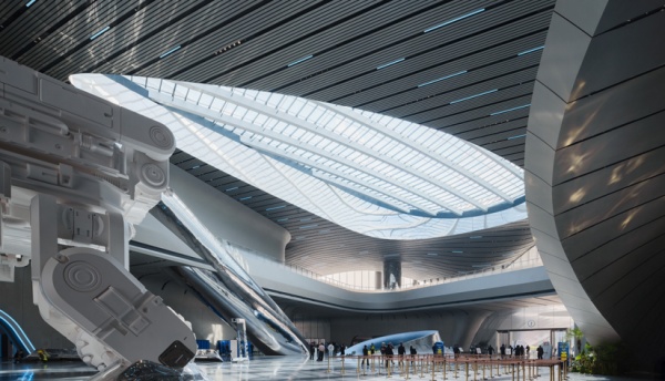 成都科學館以“星云狀”建筑外觀為核心意象,占地面積約9.2萬平方米,總建筑面積5.96萬平方米,其造型如振翅欲飛的星際巨艦,銀色金屬屋面在日光下折射出流動的光澤,宛如宇宙塵埃凝聚而成的動態星云。