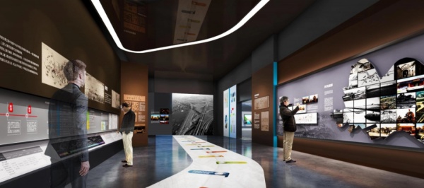 挖掘提取重慶兩江新區和寸灘特色將重慶人民在兩江新區開山破土、在崎嶇地脈中建造城市的剛硬氣魄、出港領航的開放之態融入展館,強調塑造兩江新區之寸灘精神內涵的殿堂式氛圍感。結合各內容部分精神內核,空間將“匯聚、流動、折射、釋放”的概念一脈相承,不同空間演繹不同情緒內容。